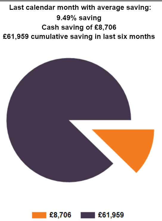 Managed versus unmanaged supply - through a supply partnership the savings on this basket over a 6-month period are almost £62k. The chart below from the dashboard shows managed pricing against open market price data.