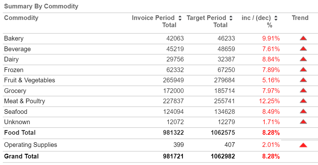 Steep year on year rises - the table below shows a £100k unit food spend taken from the management dashboard. Year on year the same business spent over 8% more for the same basket, to service similar incomes. Increases are much higher in some categories than others.